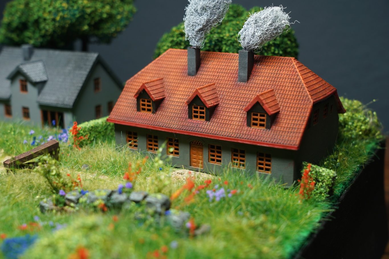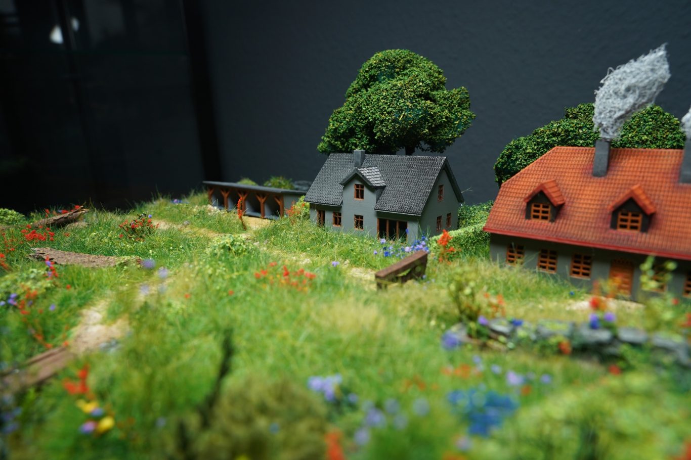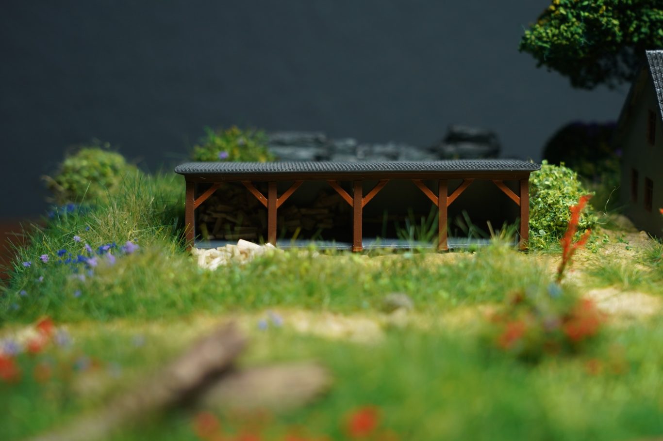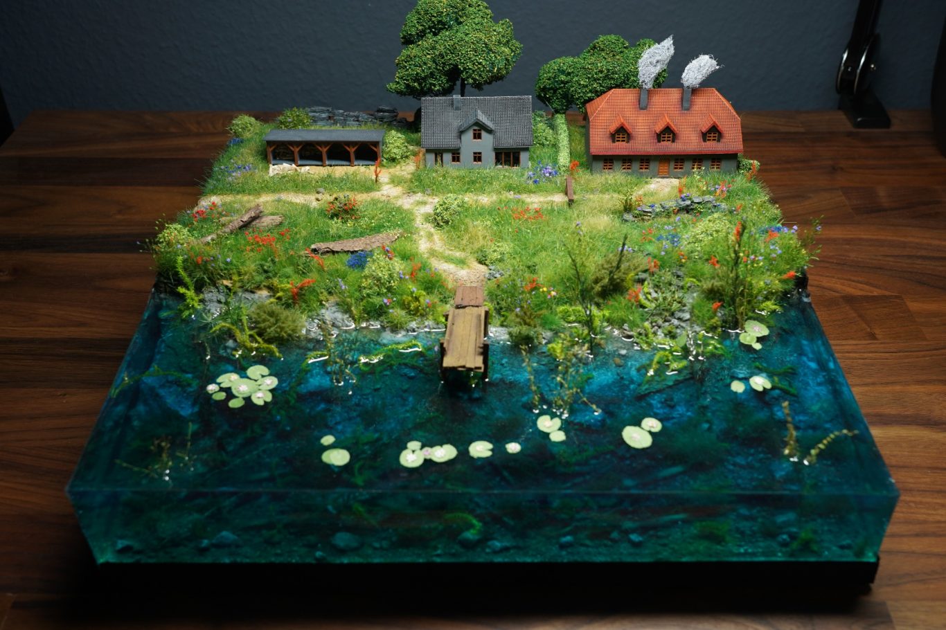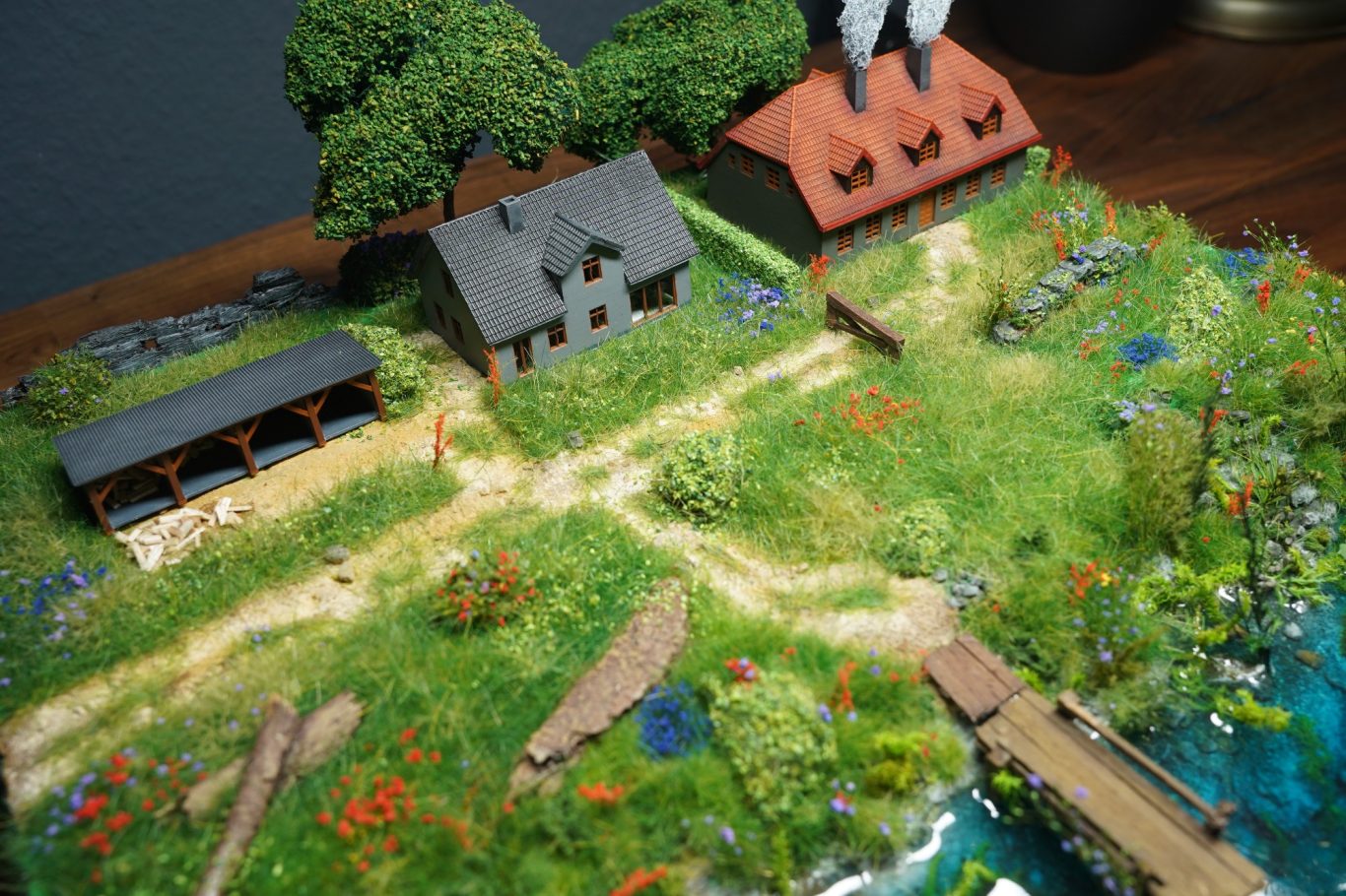 Das Diorama `Sommerurlaub am Fluss` wurde auf einer Holzplatte gebaut. Im vorderen Teil wurde das Flussbett mit Epoxidharz gegossen. Die 3 Gebäude von HOIMAT wurden mit Acryfarbe bemalt.